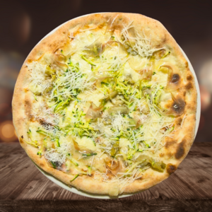la base bianca, fior di latte, carciofi sott'olio, julienne di zucchine, Pecorino romano DOC, Guanciale, origano siciliano