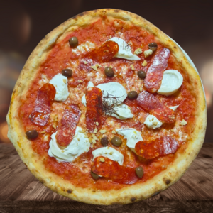 Base rossa con poca mozzarella, soppressa di suino nero piccante, stracciatella, olive nere al forno, crumble croccante.