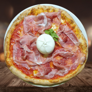 Base rossa, fior di latte, Prosciutto crudo , burrata pugliese